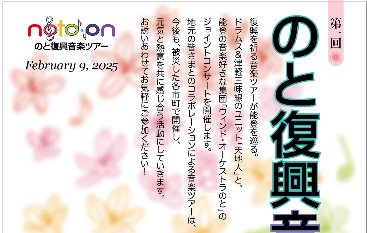 第1回として10 月 20 日に石川県能登町での開催を予定していましたが、9月の豪雨で再度被災した現地の実情に鑑みスタートを延期し、まずはキックオフイベントとして首都圏の皆さまと共に、被災地を音楽の力で元気づけることを思い開催いたします